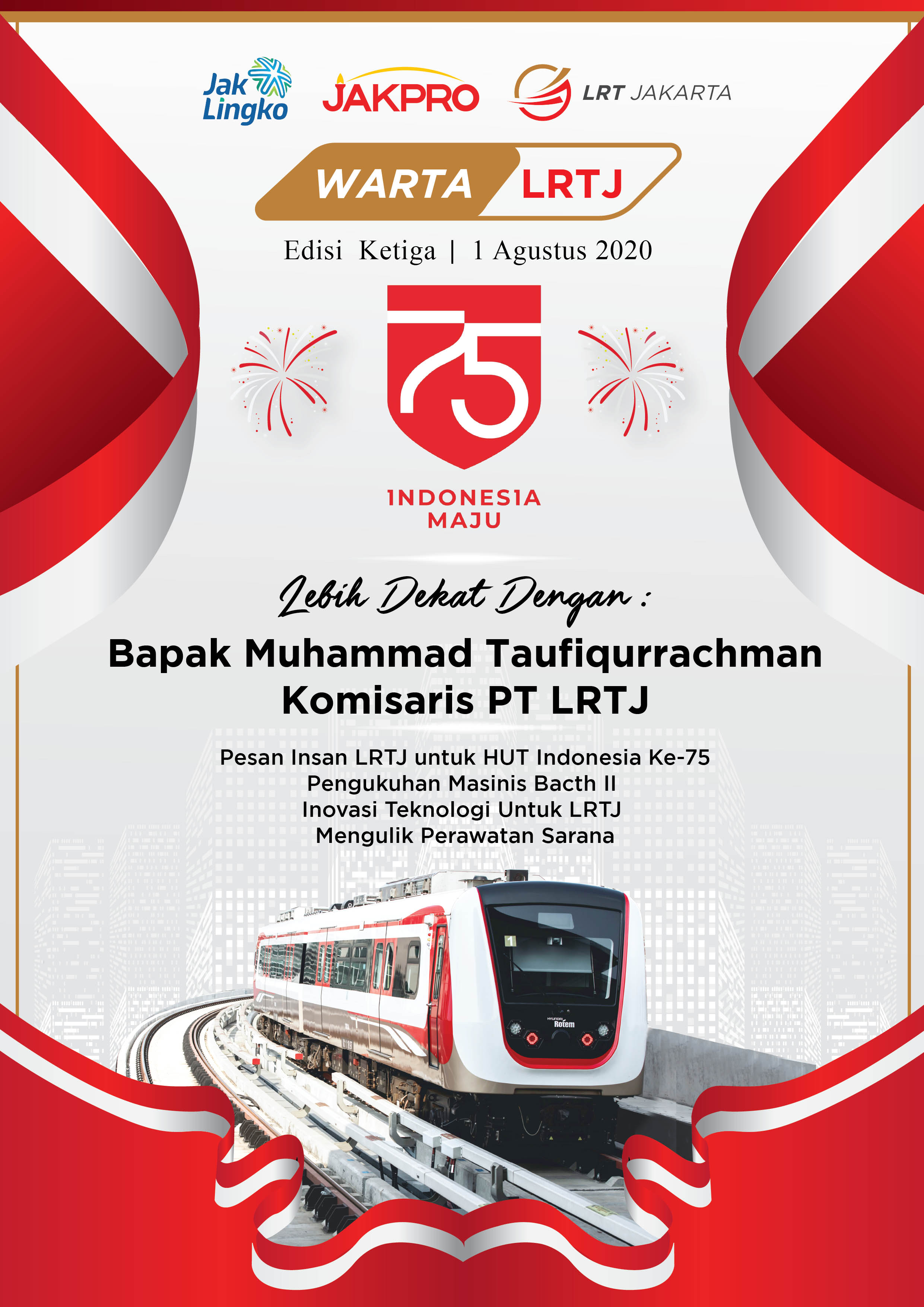 Pada edisi ketiga ini, Warta LRT Jakarta ikut serta merayakan HUT Kemerdekaan Indonesia yang ke-75. Keluarga Besar PT LRT Jakarta menyambut hangat kedatangan Bapak M. Taufiqurrachman sebagai Komisaris PT LRT Jakarta dan kita akan mengenal lebih dekat deng