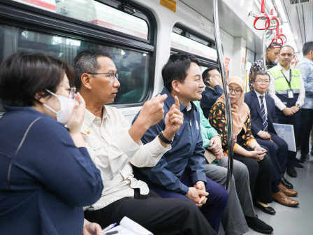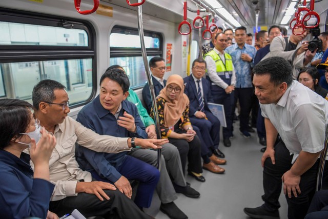 Penjabat (Pj) Gubernur DKI Jakarta, Heru Budi Hartono mendampingi Menteri Agraria, Infrastruktur, dan Transportasi Republik Korea Selatan, Won Hee-ryong beserta rombongannya untuk menjajal LRT Fase 1A, rute Stasiun Velodrome ke Stasiun Pegangsaan Dua, lal